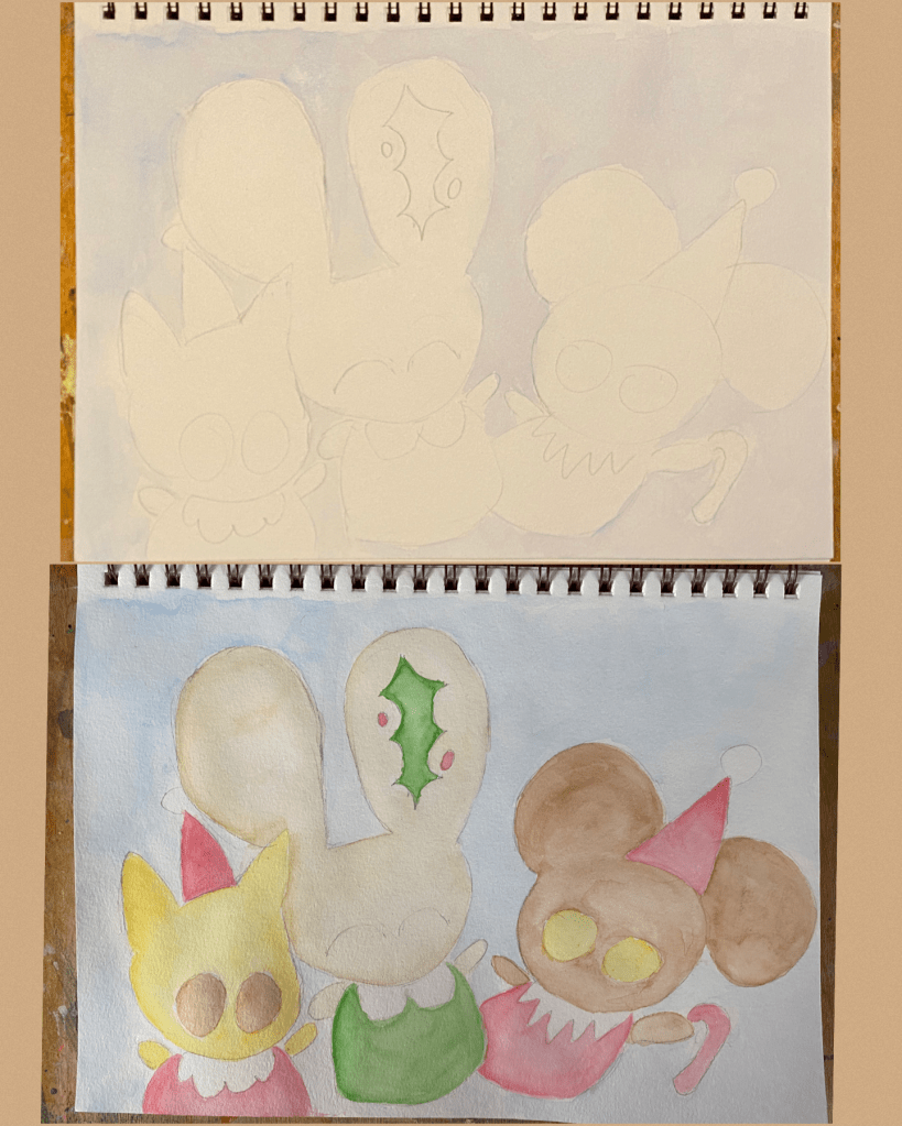 Once again, a lot of fun painting this piece! It is always exciting to try out new products too. I thoroughly recommend both the Holbein watercolor tubes and Finetec Pearlescent pans, and no I am in no way sponsored by them so this is genuinely my personal opinion. Watercolor is one of my favorite medium I enjoy working with as I love the dreamy effect. And most of all, painting kawaii things like this makes me happy. A Merry Christmas from Kitty, Bunny and Teddy!