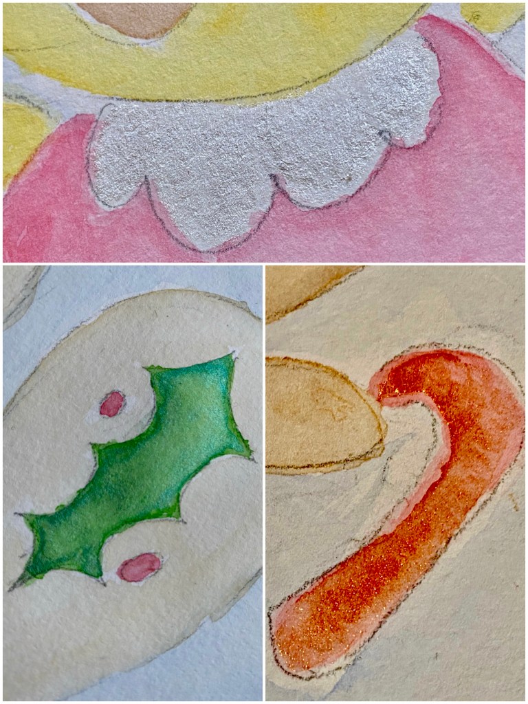 Once that layer of watercolor was dry, I thought adding some sparkles would be an idea. It’s Christmas! In my drawer I also discovered a pan of Finetec Pearlescent watercolors which I bought at a trade fair a few years ago. I mainly used this for the white bits like the outfit collars (in white), the holly on Bunny’s ear (green an red) and the cane. And here are the closeups of the beautiful effects they made!