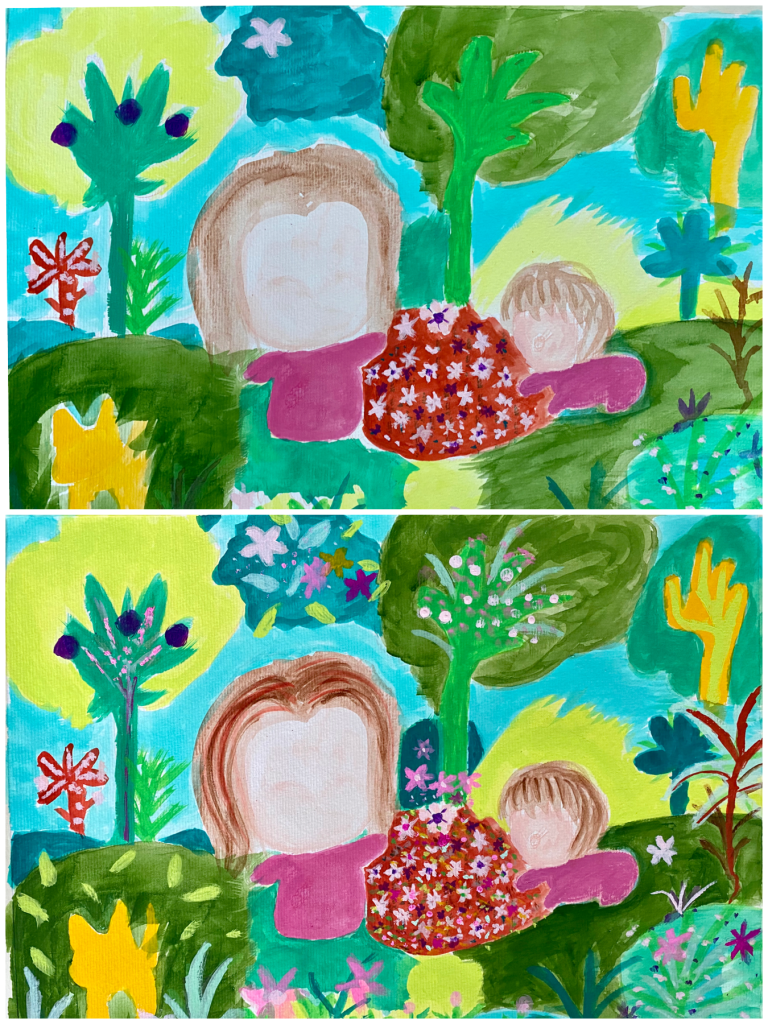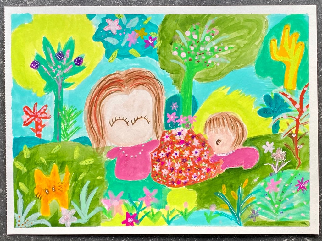 One of the reasons I enjoyed doing this painting was that I got to experiment with gouache, a medium I’ve hardly used before. It’s more versatile than I had imagined, and wow the vivid colors! Something I need to use more often. More importantly, I am very pleased I had the chance to document this happy moment with my mother and create such a beautifully cheerful painting. I now get emotional when I see this!