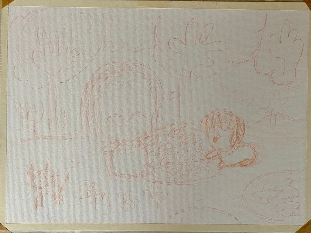 In my blog about Thumbnails, I outlined my inspirations. It is a sweet story about me as a little girl crawling over the flower bed at a park and reaching out! I must have been two or three. Although I don’t remember it at all of course, I do have photographs of this kawaii moment. I’m with my neighbor friend just curious as to what could be these pretty things laying in the flower bed. And our mothers are happily overlooking and thinking how cute and adorable we are. Precious memories! And now I transferred one of my ideas here on a large A3 paper (Canson’s Mixed Media) using aquarelle pencil. It’s just me and Mama and a random cat!