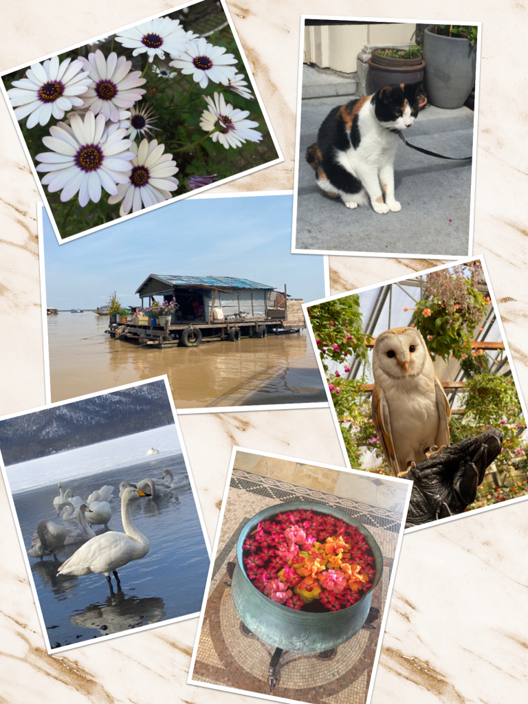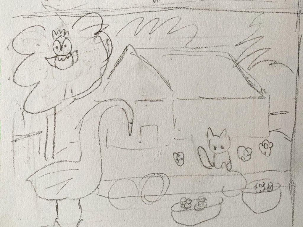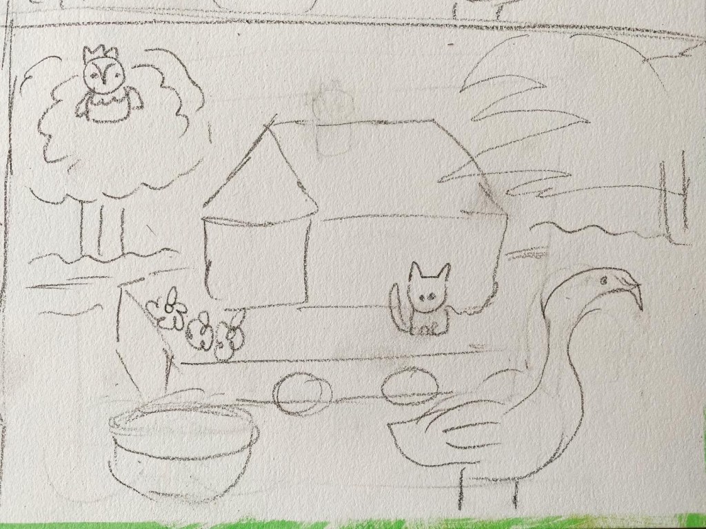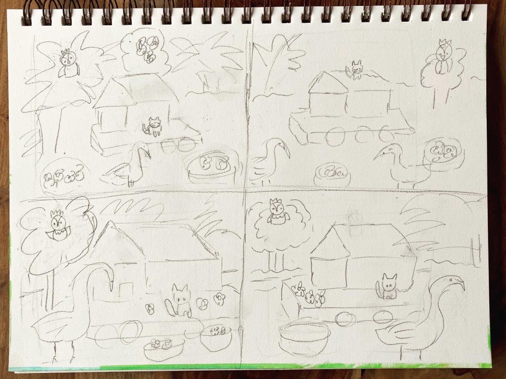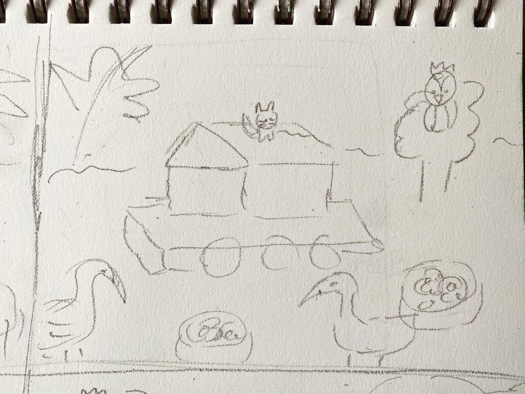 Then I thought of a cat on the roof. Owl still on the tree and two swans. Hmmm…