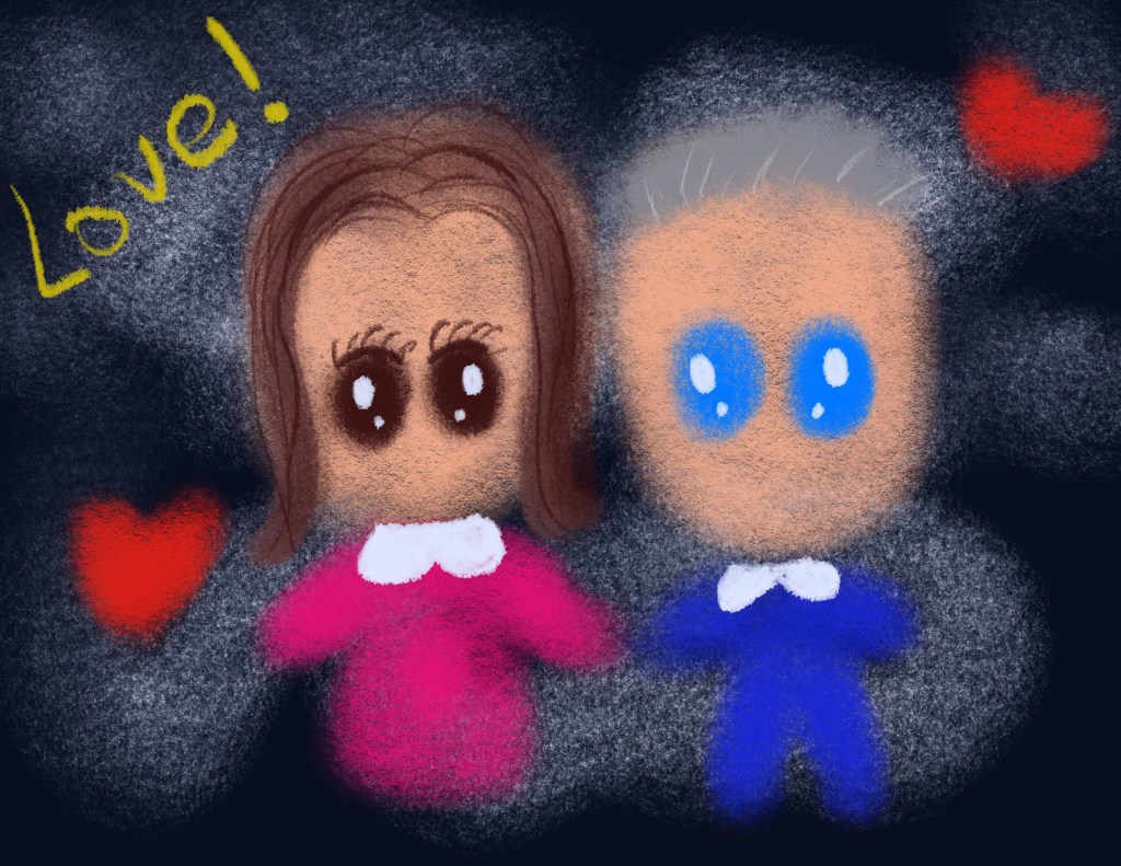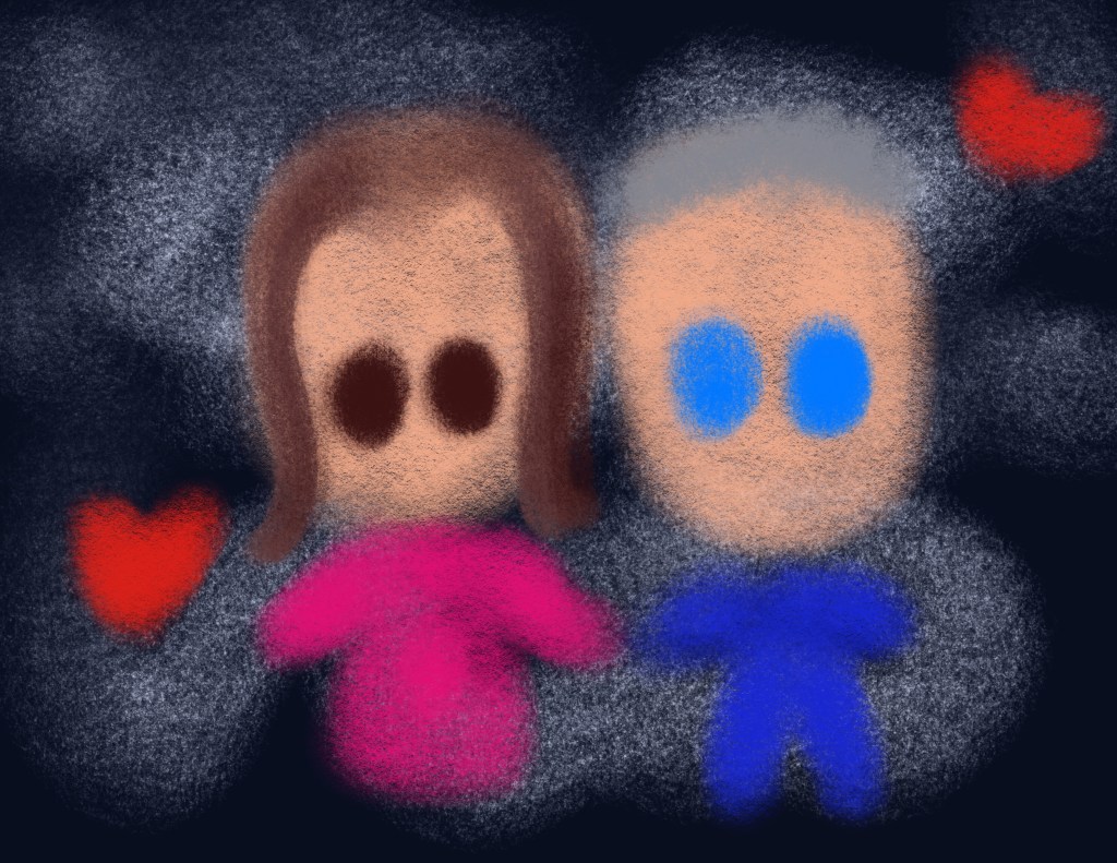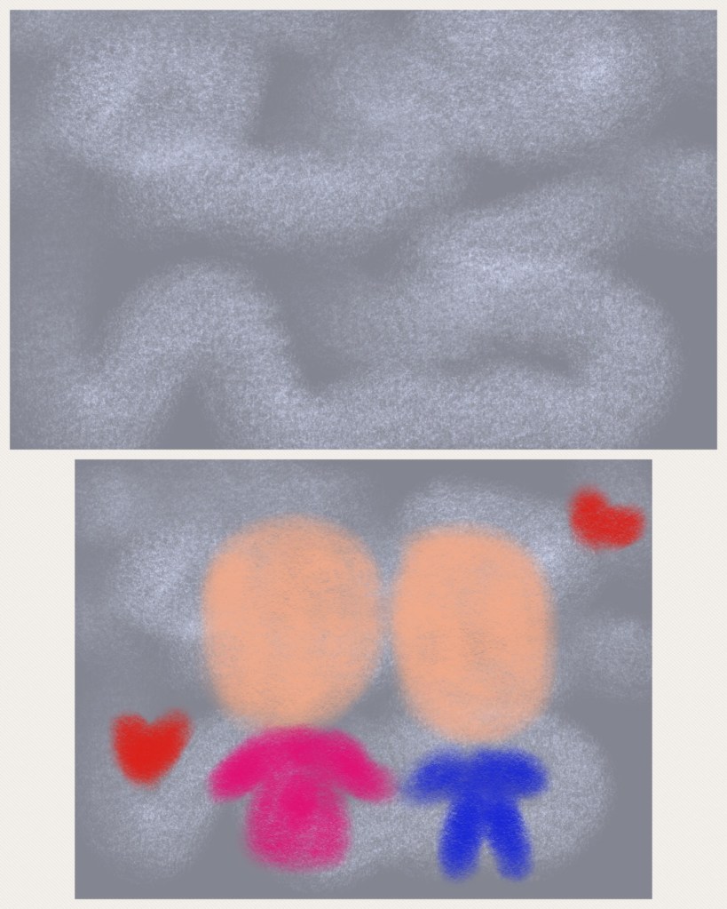 … and I can whip out my iPad and start painting away on Procreate! Here is a quick and easy one I created, this time going for charcoal and pastel. Making my background grey, I then doodled in clouds as first layer. Boyfriend and I were then drawn along with some hearts