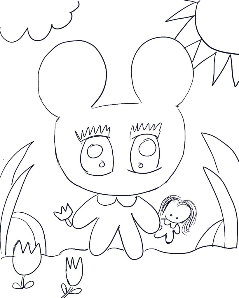 And now that I was done with painting the subjects, how about the ground? I painted it grey first, then layered it with some green colored “Clay” once again from the Medium menu. It looks as if Teddy is standing on some soil, and as you can see, I even added a shadow of her on the ground. Hope it looks right! And now this is my kawaii Teddy clutching on her Little One dolly.