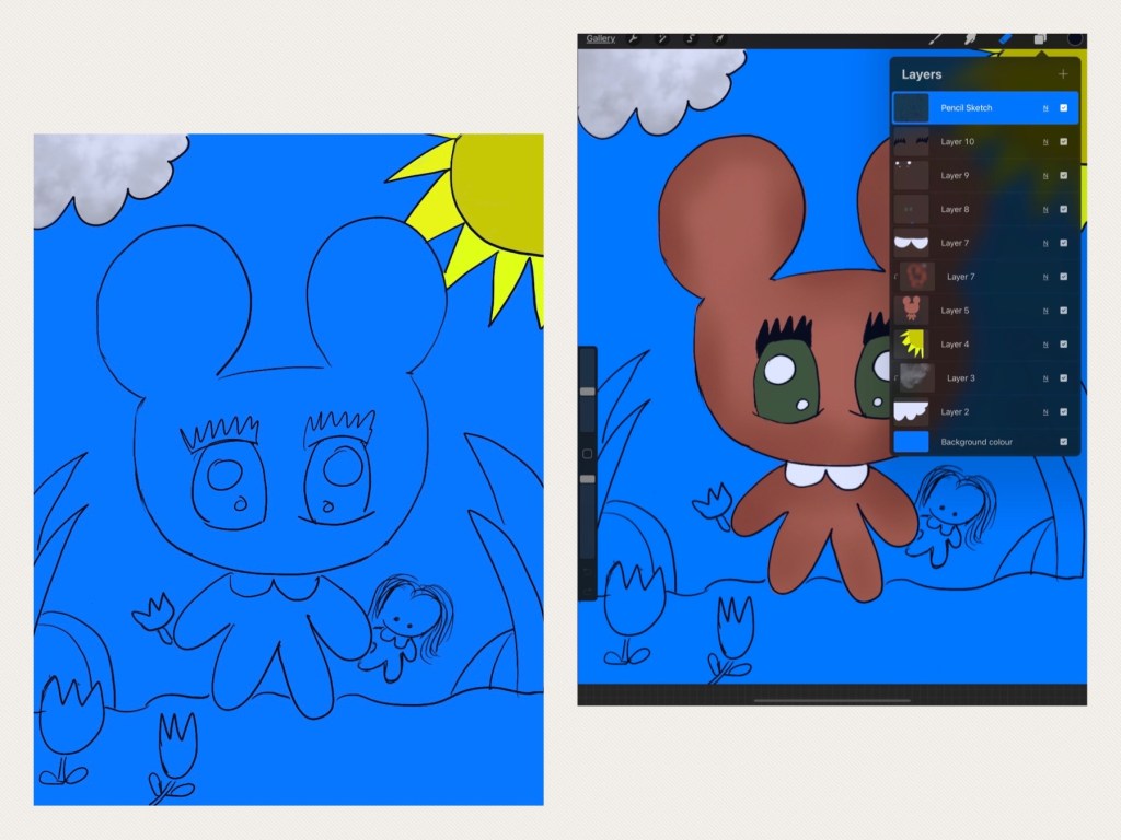 A bit of role reversal here as I decided to draw my Teddy. This time it’s her turn to be holding a doll, in the form of Little One! I figured a change would be good because I draw loads of my Little One clutching her Teddy. Let’s see how equally cute it will all look when reversed! Here, I am once again practicing my digital art techniques on Procreate and almost ready to jump into the next lesson I’m still on the airbrushing chapter and once I have the chance shall definitely advance further.
