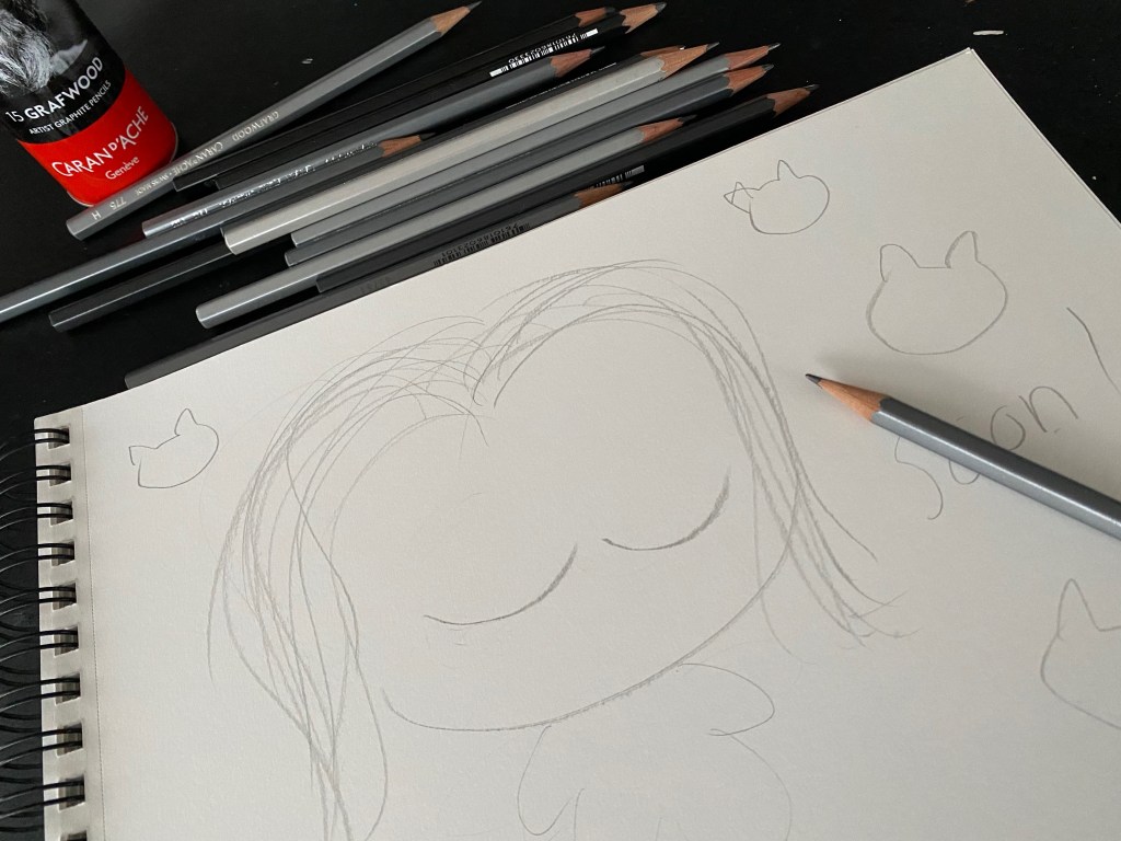 Getting quite overwhelmed, I took out my sketchbook and pencils to draw. It’s a great way to deal with stress by helping me vent my emotions. This time though, rather than express how frustrated I am feeling, I decided to be more optimistic. Closing my eyes and breathing deeply, telling myself it will all be over soon. Surrounding me are my many Hello Kitty’s reminding me to calm down and take my time. “There’s no rush” they say, “sooner or later in a few months we will all be ready”. And here is my little pencil sketch I made using a variety of leads with my 15 Grafwood graphite pencils.