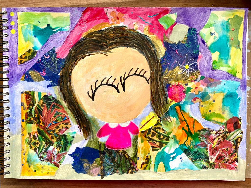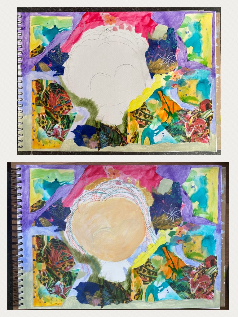 Now I was ready to paint LIttle One! If I want to add more in the background I can do so once she is done. I made a sketch first using charcoal pencil. Having a better idea of what she would look like, I incorporated more collage in the background, including odd bits I had made from the past as well as paper napkins an wrapping paper. Another I added were some flowers from rubber stamps, something I haven’t done for ages. Great to rediscover! What an interesting melange is turned out to be. Once ready, I painted the face with a mixture of Quinacridone Nickel Azo Gold and Titanium White and made streaks on the hair using oil pastels.
