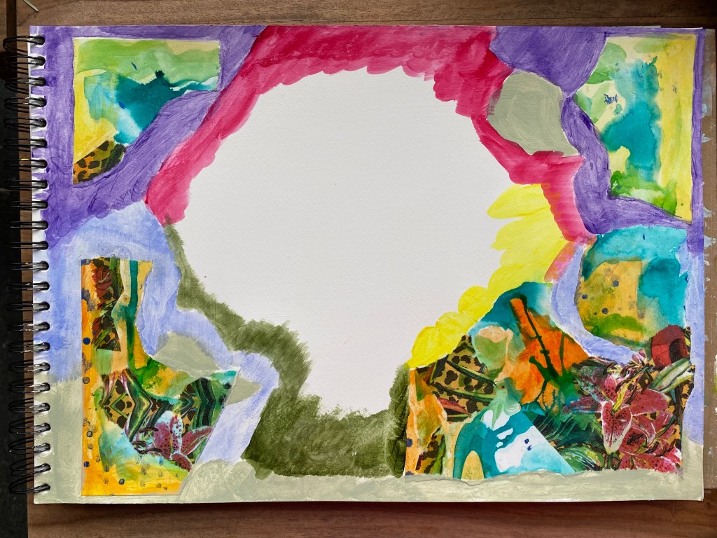 This piece is actually the second painting using the collage paper I had “accidentally created” as seen in my earlier blog So What Happened? To recap, I was working on a painting which I decided I didn’t like anymore and somewhat couldn’t get out of so decided to recreate into collage paper later to be used up. Illustrated in the below photo is the created collage paper on the top. The bottom is what I did with the remainder of the pieces of collage: