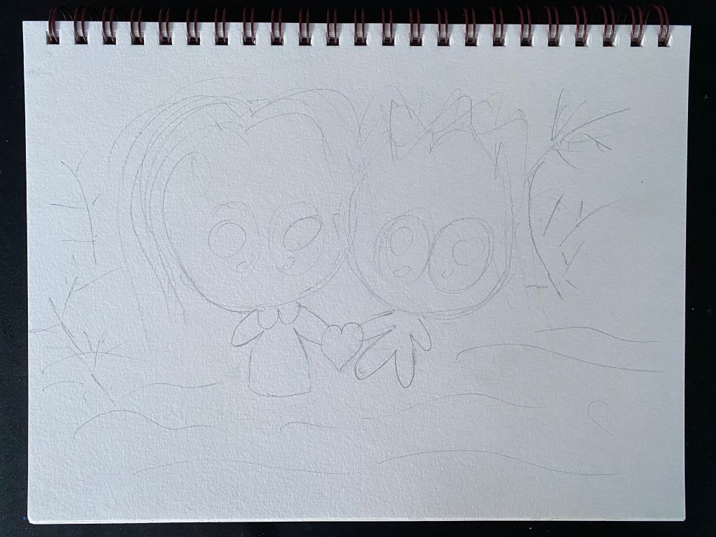 Strathmore’s Visual Journal for Watercolors was used for this painting. First I made a rough sketch using graphite pencil. Lesson here I had learned is not to use aquarelle pencils which are water soluble and hence blend unwantedly when trying to fill in with watercolor. What a cute sketch of me and my boyfriend together walking in the woods. Our heads are so big that it was difficult to draw us holding hands without making the arms too long so I added a heart in between instead haha!