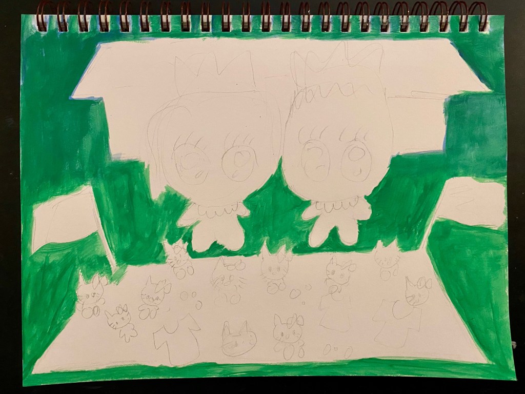 And what a kawaii theme. My boyfriend and I standing side to side awaiting the little customers. Laid out on the orange cloth are the many kitties sad to leave but at the same time excited about their new home. We are dressed in orange which is the attire for King’s Day as it is the color of the Dutch royal family. Once I was happy with the sketch, I went about painting it, starting with the background in green acrylic ink. I started with blue for the sky but changed my mind and made it green seeing that part of the Dutch flag is blue.