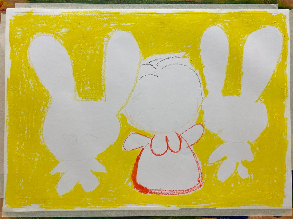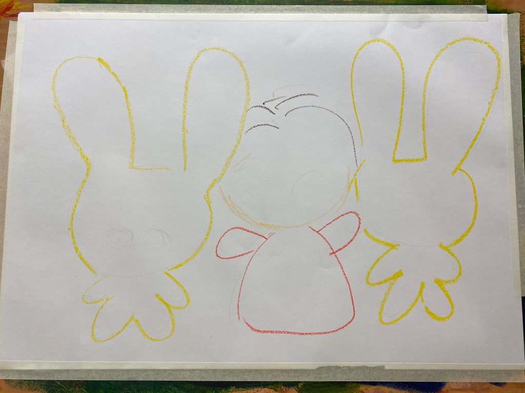 Special paper was used for this painting. Although not thick paper, it was a large sheet with a smooth surface so the oil sticks and pastels can slide smoothly. Also you don’t have the risk that the oils penetrate but stays on the surface with the pigment. I did a very light sketch with pencil, and I say very light because the graphite from the pencil could mix in with the oil from the sticks and soil the outline. So far so cute, as I scribbled in a rough outline with Little One flanked between the two big bunnies.