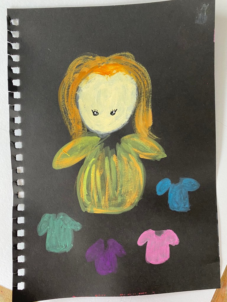 Working with gouache paint is so much fun! I would like to share another experimental painting I made the other day. This time, I used black paper. Seeing that gouache gives a matte and chalky finish, I imagined it would look stunning on dark paper. And I was right! Little One was further thrilled to be subject of the painting again, and how sweet does she look surrounded by her pretty dresses. Today, she tried on a funky hairpiece with metallic purple streaks, how cute is that! She loves bright vivid colors too and trying to decide what to wear today. Looks like she’s gone for the yellow one! Now that compliments well with that funky hairpiece.