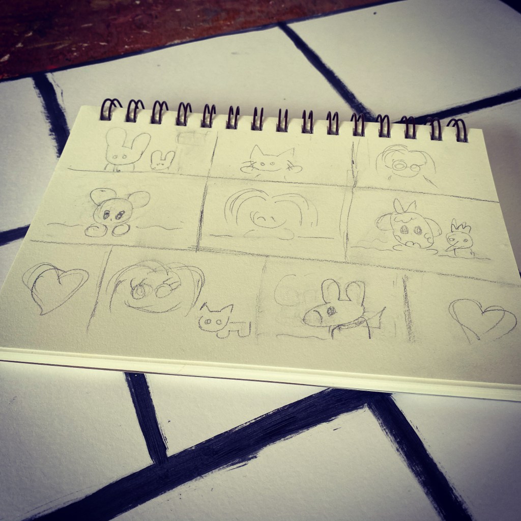 I outlined my idea on a small sketchbook. Eight frames and just to “cute it up”, I added some hearts on the side. Little One, being the organizer, is in the center and surrounded by her friends: Little Bunny and her tiny sister, Kitty-chan (inspired by Hello Kitty), Bubbly One, Teddy Bear, Moo Cow and her Owl, Mad Cat Girl and Doggy (inspired by French illustration Lisa of Gaspard et Lisa). Glad they were all able to make it!