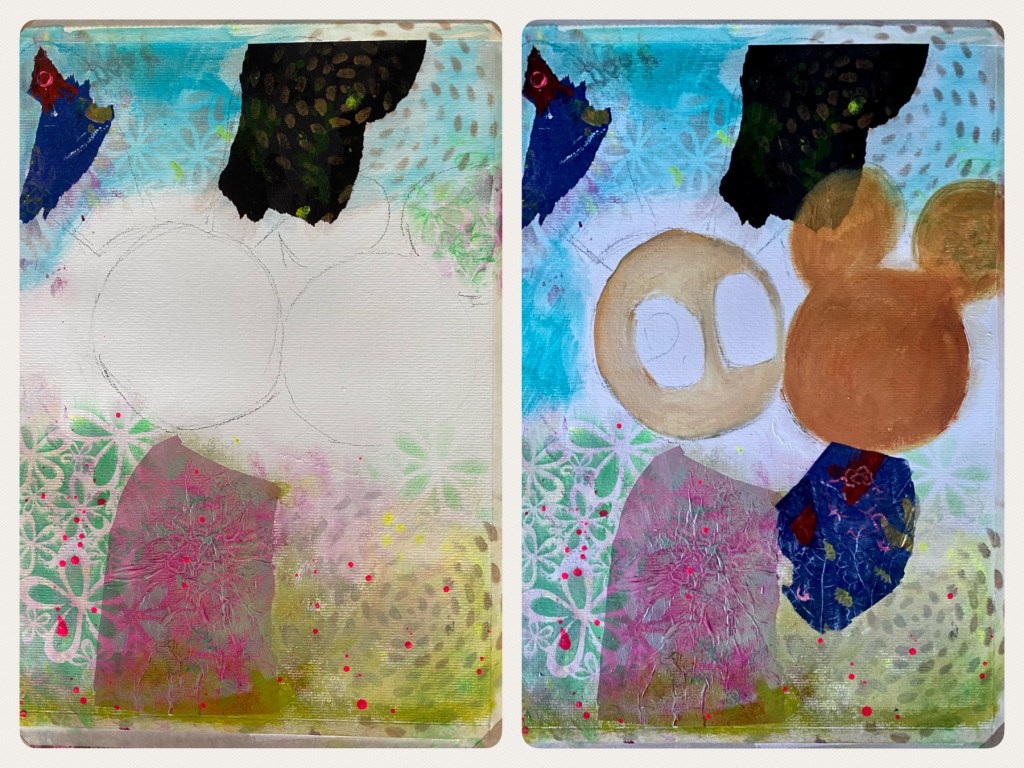 The sky was firstly colored in with some Marine Blue. Seeing that this lesson calls for getting inspired by past work, I went for two whimsical animals typical in my paintings. Little One certainly features in much of my work but as she is seen in quite a few from my Juliette Crane classes, I thought it would be a good chance to do something different. And she doesn’t mind taking a little break anyway! After gluing on a few tissue collages (some scraps from the past too), I further went on and added more stencilled flowers using Emerald Green gouache, followed by splatters of fluorescent pink ink. Then I penciled in my characters before testing out the colors, combining of Antelope Brown, Quinacridone Azo Nickel Gold and Titanium White.