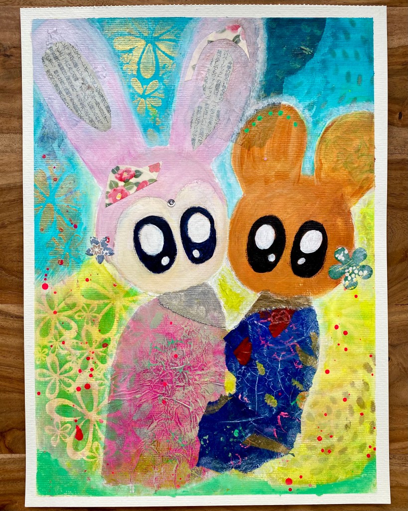 It took quite a few adaptations before getting the painting to my liking. These included playing down the black part of the sky firstly with some white then once dry topping up with more Marine Blue. Bits and pieces of collages were further added such as Japanese-language newspaper clippings and origami paper. To soften the appearance, I then tapped on a thin layer of white gesso with my fingers. The collars of the Kimonos were colored in with metallic shades to add some “bling” despite it not being very “Japanese”. To add a bit more accent, I carefully splattered on more fluorescent pink ink. A bit of white was then smudged around the outlines of the characters for that “halo” effect so they pop out more. Finally to further complete the painting, I lined some areas with glitter glue (collars) and a glued a silver sequin on Bunny’s hat. I was generally happy with the outcome of the painting, but one thing I might keep in mind in future is not to make the heads quite so round. But still, the piece is kawaii so I’ll leave it for now.