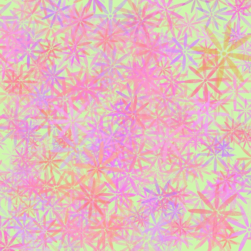 Having made the painting a square shape, I firstly made the background a bright yellow-green color. The first layer was then about flowers to emulate the cherry blossoms from the photograph. I just laid a random bunch of these Retro flowers, available as pre-set patterns on Procreate in a variety of pinks and lilac shades.