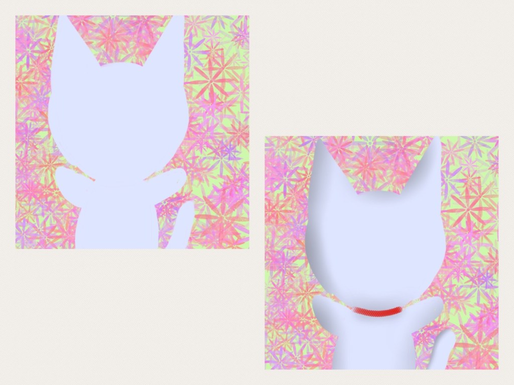 Upon creating a new layer, the cat shape was drawn in white with airbrush and autofilled. So far so cute! I then added the shading on a new layer with clipping mask before putting the red collar on this sweet little kitty.