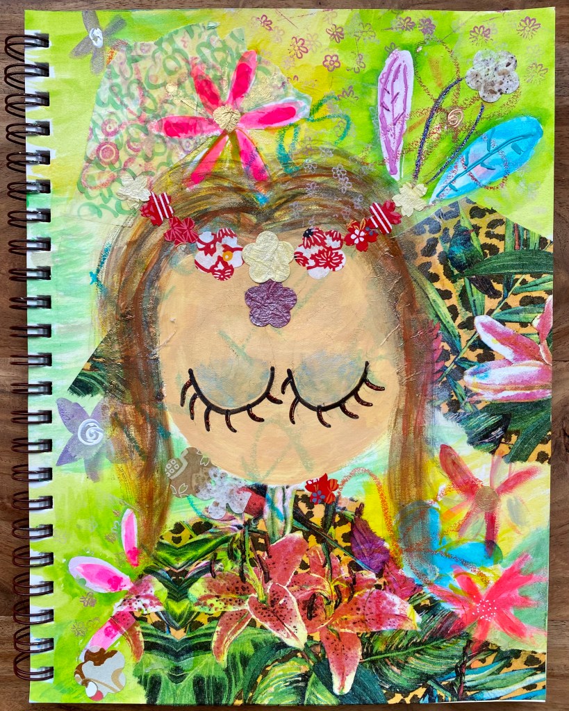 Doesn’t Little One look ever so adorable and pretty with flowers in her hair, wearing a floral headband and poncho? It’s wonderful to be back to some mixed media work like this. Collages are a great way to incorporate interesting patterns and accents to a painting, thereby making it more lively. In addition to bright vivid colors, I do love floral themes. I find them uplifting, and they’re perfect to paint about during the warmer months. I look forward to creating more like this!