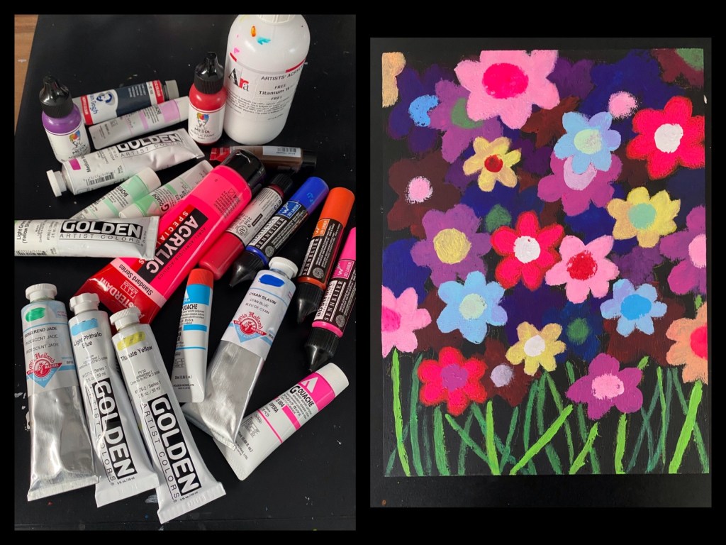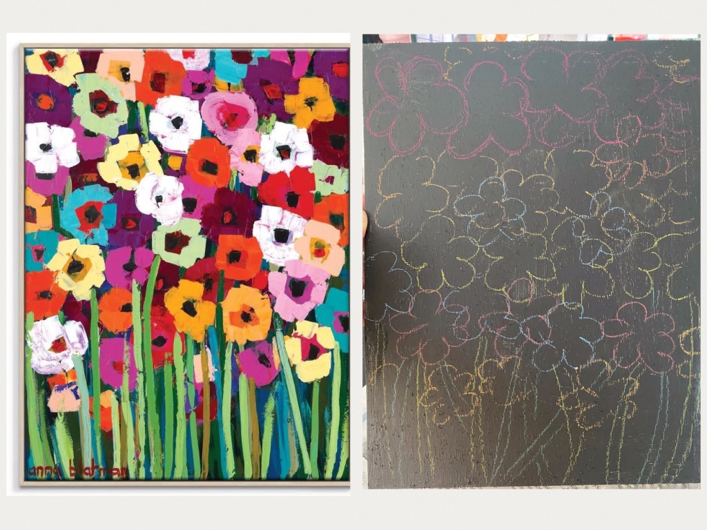 Using the artwork as a reference point, we began sketching our flowers using a Stabillo pastel pencil. That way, the colors stand out more against the black background, and more importantly we can easily erase any mistakes by simply rubbing it off. Just a bunch of flowers with green stems below. I used a variety of colors to be able to visualize what it would look like with so many flowers and be able to distinguish them better when I fill them in with paint. So far so cute! Notice how I still insist on rounded shapes in my drawings.