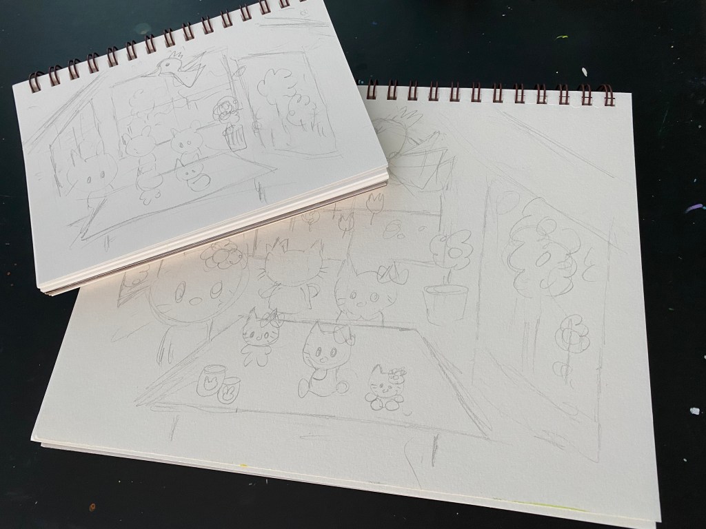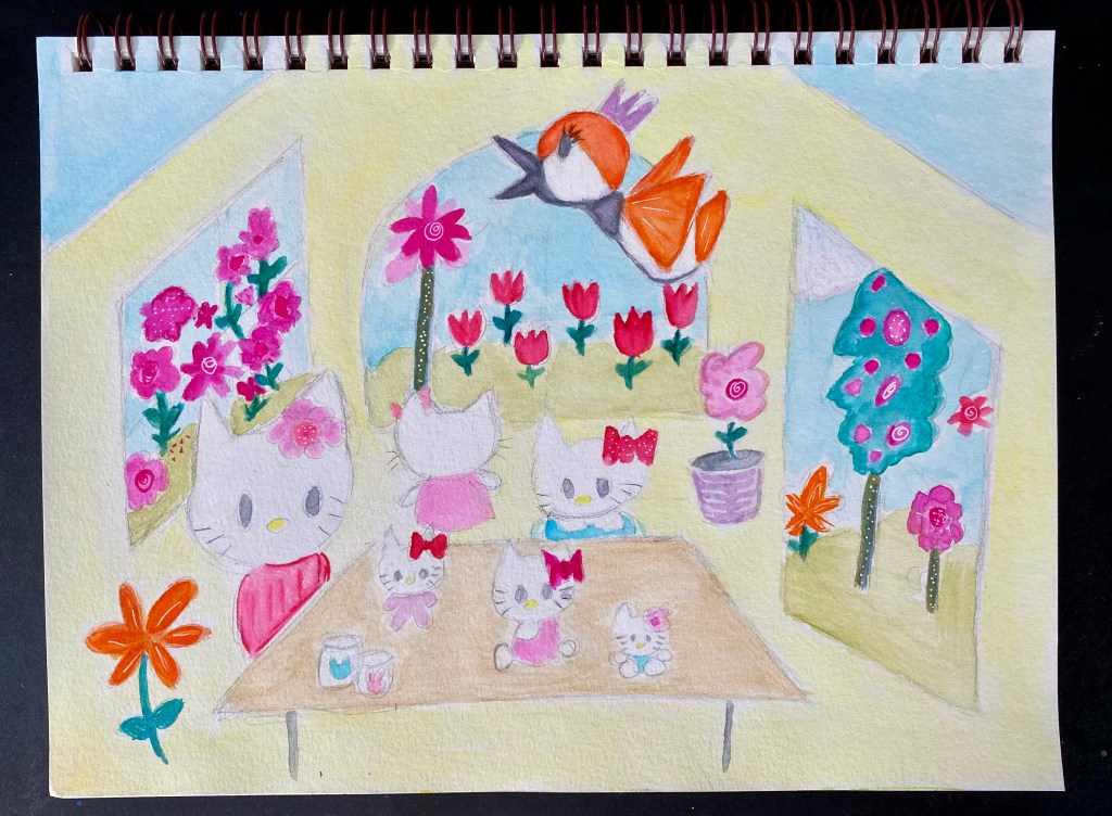 I firstly outlined my ideas with pencil in my small sketchbook. As part of the ceilings in my room is sloped, I made the background with two sloped ceilings with windows. In the middle is a table surrounded by Hello Kitties, some sitting around and others placed on the table. One is looking out the window admiring the pretty flowers. As we have a beautiful garden, I wanted to incorporate that too.