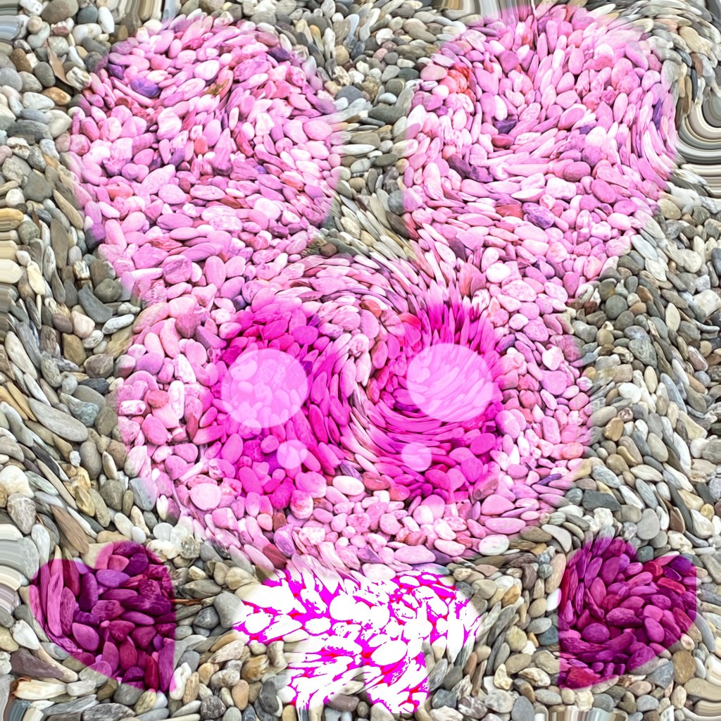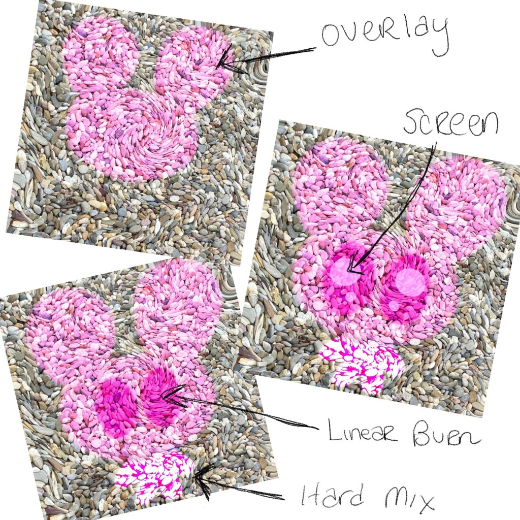 Seeing that Teddy would look a bit lonely in the painting, I added some hearts also in the same Light Pink. Switching it to Linear Burn, though, produced another effect. It did not turn into the same pink as the eyes but got darker! A likely explanation of this could be that the pink was directly added on the grey pebbles rather than on Teddy’s pink face. How interesting is that! And here is my pretty little Pebbly Pink Bear…