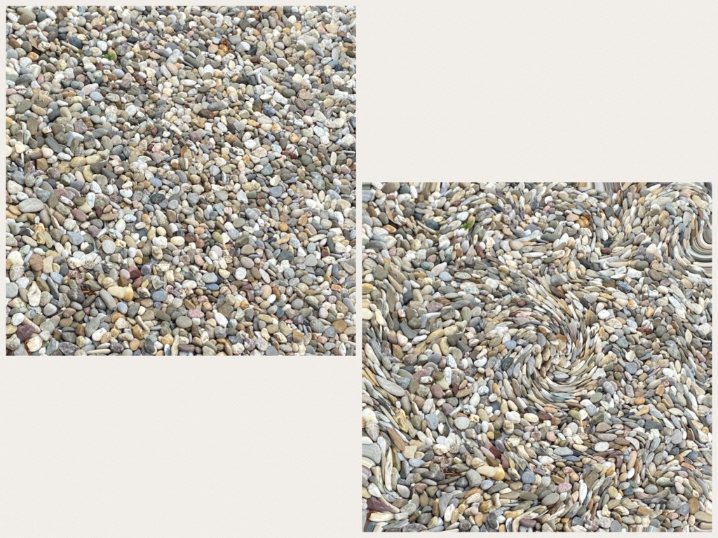 I began with a photograph of a bunch of grey pebbles I had taken earlier. Then with the Liquify function, I twirled the center of the photo around. How cool is that!