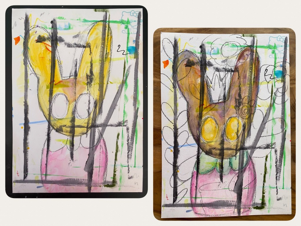This lesson, as Juliette says, is a fun project to work on top of a background or an old painting you don’t like. In my case, I went for a scrap piece of paper I had used for testing colors. Those black straight lines you see are from also using that paper as an undersheet along the edges of a sketchbook page I had been painting on to protect the page underneath from getting soiled. It was a bit of an intuition when Amber my long-lost rabbit came to mind. She is standing behind the fence which separates us, and we sadly cannot reach each other. We are both crying. Could it be the grief that’s resurfacing after all these years? I sketched her in with some charcoal.