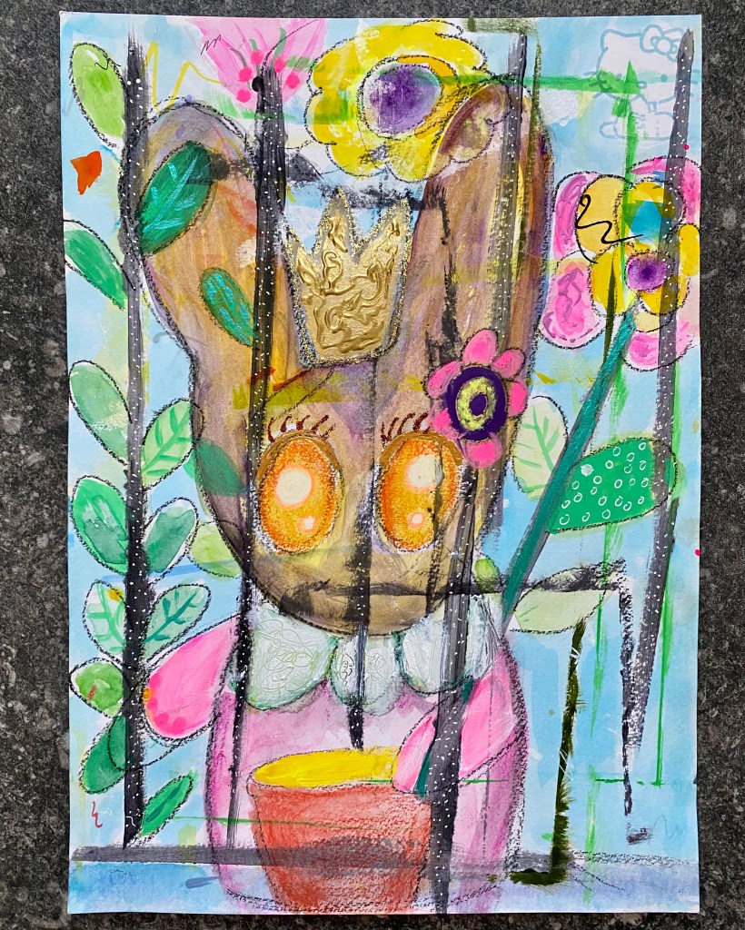 Following Juliette Crane’s classes is so much fun! Once again, I was able explore possibilities and extend my imagination, this time on some plain piece of scrap paper. The best part was switching from a somber repressed mood to a more open cheerful one. It is like a journey of opening up hidden emotions! Fifteen years on, I still think of my little pet rabbit and realise that drawing about her is part of the healing process. Amber will definitely be featured in more of my artwork and I think Little One and her friends would love that! Thank you Juliette for letting this happen.