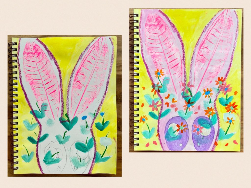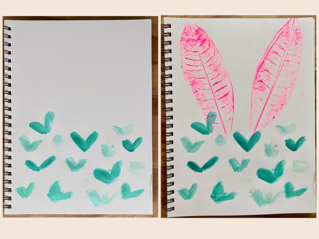 How pretty that all looks now. First starting off again with some scrap paper with leftover paint, I do enjoy recreating and experimenting. The warm background amid the cooler shades of the bunny also worked rather well I must say. Once again, the leaf imprint further turned out beautifully especially with this vivid shade of fluorescent pink. I shall definitely be taking advantage of nature again and be exploring more possibilities!