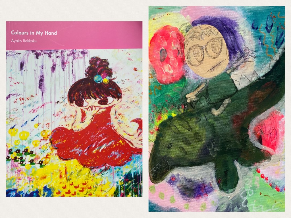 And now is the time to choose an artist you’re well-inspired about. For this painting, I chose a Japanese illustration artist called Ayako Rokkaku. Her work is really cute! Like me, she combines kawaii illustrations with abstract art using vivid colors. A little girl is frequently also featured in her artwork too, similar to my muse, Little One. A few years ago, I had the pleasure of visiting her art gallery near Amsterdam, even meeting her in person whilst she went about her painting. A very sweet pleasant person but a bit shy. Without emulating her too much, I selected some salient features of her work, particularly in relation to her muse: