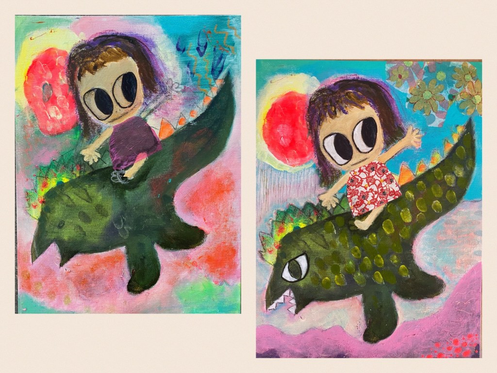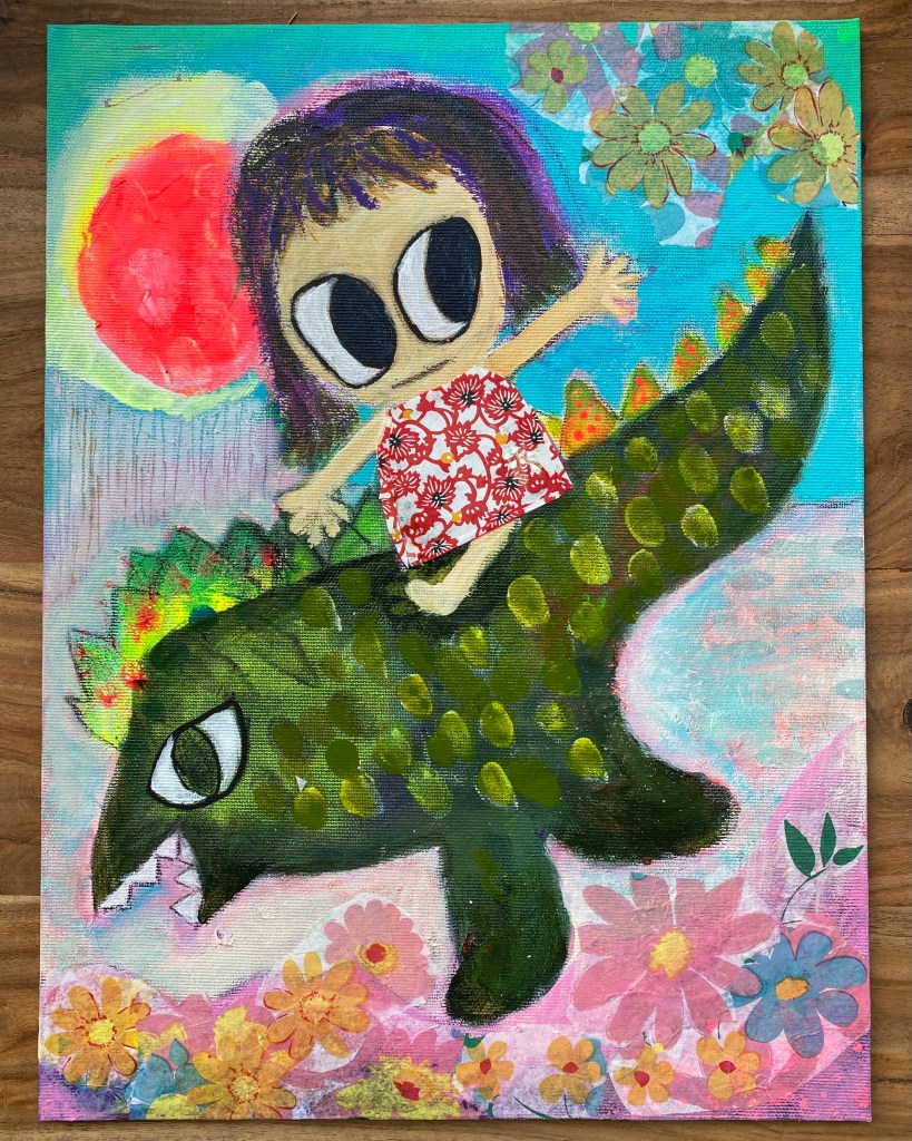 Little One is riding her Kaiju! In Japanese, Kaiju is the word for “monster” which has since become mainstream in the anime world to refer to Godzilla-type dinosaur-looking characters. Scary but still somewhat kawaii especially in an anime setting. Today, I’m sharing with you a painting I made whilst following Juliette Crane’s Serendipity I classes, this next chapter called “Using Inspiration From Others”. And who did I choose? Keep reading and you’ll soon find out!