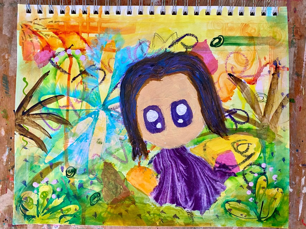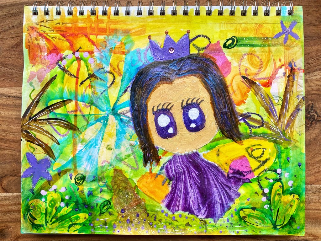 How about a cute crown for Little One? I think that would be cute! I painted one with Golden’s Heavy Body Acrylic in Light Violet, then proceeded to use that paint to add some flowers on the corner of the page to give the painting some balance. Then I once I was done, I decided to finish off the piece with some some glitter glue and a sequin on the crown and more glitter glue on the flowers and of course, Little One’s eyelashes. Realising that the orange bit next to her hand could be a basket, I enhanced that more. She now looks like she could be collecting some lavender from the ground! As such, I dotted in some gouache in Pale Lilac and Metallic Violet, with the remainder of the latter color lightly brushed on her hair. A few more details were then doodled on the leaves with a white gel pen. And now I’m good to go!