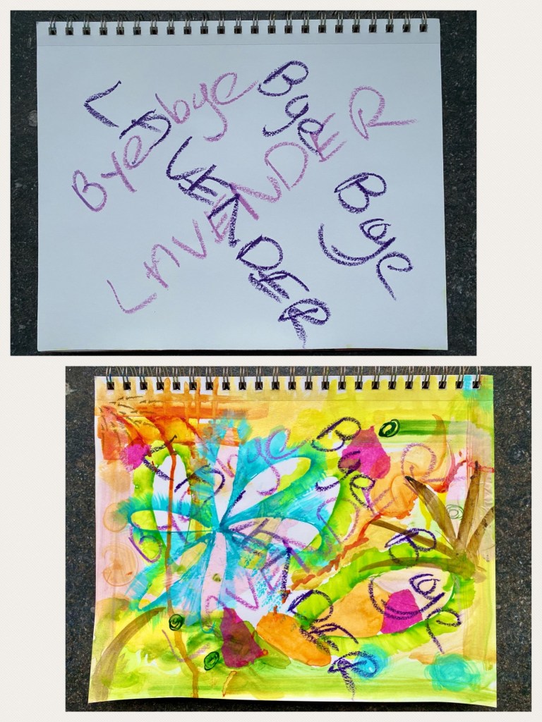 First I grabbed my Strathmore Mixed Media Sketchbook and on an empty page scribbled “Bye Bye Lavender”. Sennelier’s Oil Pastels in a dark and lighter shade of violet were used here. Then I went about randomly adding layers of acrylic and colored india ink all over the page, working with a range of greens, yellows and oranges to mark the beginning of autumn. Bits of pink and orange wrapping tissues were then glued on as small collages around the area. I then introduced a cool color like turquoise blue against the existing warm shades to make the painting more interesting. At this point, it was intuitive art as I added layer after layer of colors without any real direction. The only thing I had in mind, though, was somehow fitting in Little One in the picture and hence I purposely left some areas blank.