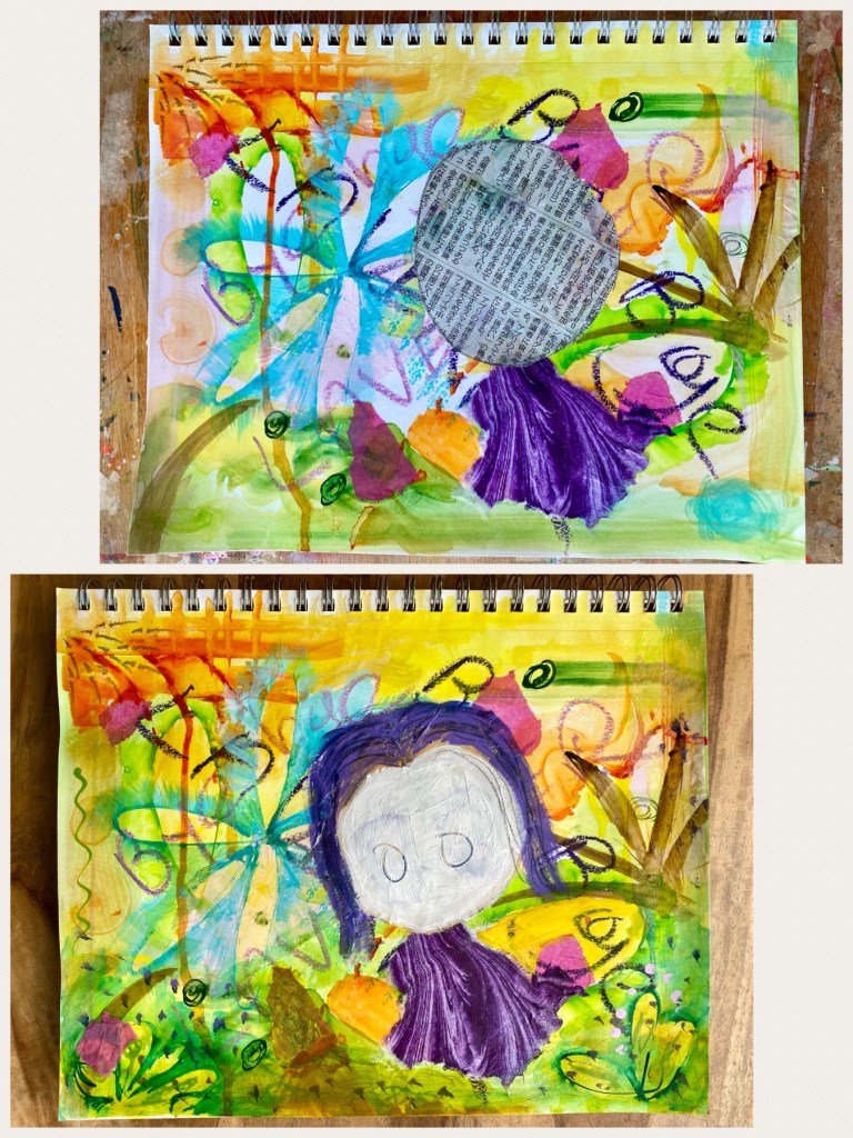 On my desk, I happened to find a torn scrap piece of purple Mulberry paper lying around, the remainder of what I had used for a previous project. Glad it came in handy, and funnily enough, the shape and patterns on the paper was perfect to resemble the dress! And so I glued it on, followed by adding on the head. Something I picked up during Juliette Crane’s painting classes, a circle was cut out from an old newspaper to make it easier to draw the face without the underlying background layer being visible. The face was painted in with my usual blend of Quinacridone Nickel Azo Gold and Titanium White. Just for fun, I thought I’d make her hair purple this time to go with the lavender theme. Golden Heavy Body Acrylic in Light Violet was used here. The background meanwhile was further being worked on by more layers of colors to give an impression of being in the wilderness.