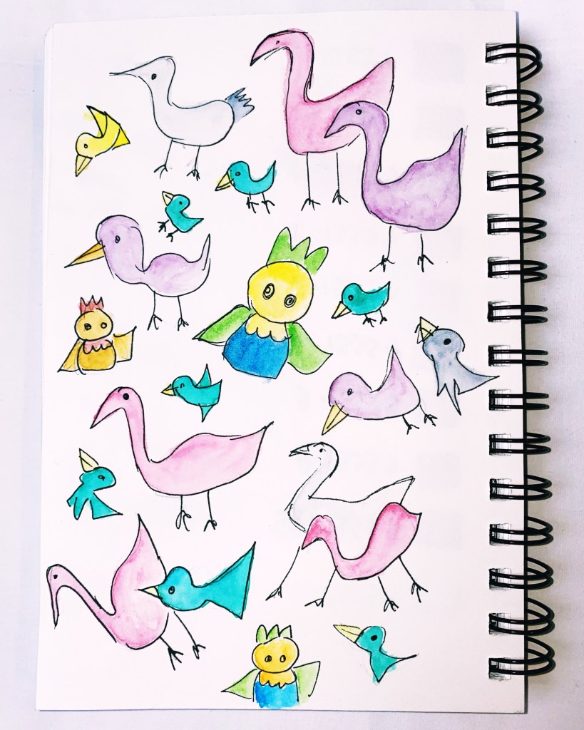 Along with my sketchbook I brought with me a small travel-sized box of watercolor pans. Sennelier has a really cute one with 12 assorted colors. Accompanied by this I also packed a packet of six brush pens in which you fill water. Great substitutes and certainly more convenient than lugging brushes along, especially when you’ll need a jar filled with water as well as space to lay everything! I first drew these kawaii birds with a thin black marker by Faber Castell Pitt Artists Pens. So far so cute, on the left page of the sketchbook!