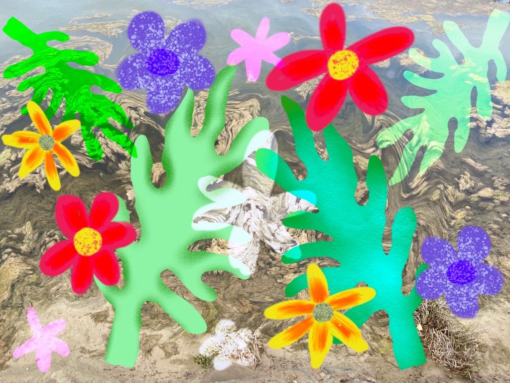 Initially I was going to draw Little One. I did start to but then as I had already made two drawings with her in it with a third one coming up, I decided to go for just flowers instead. As in the case of the sea plants, each of the flowers had their own layer to enable moving around and adding effects and details on where I wanted. Then I decided to play around with the light effects of the colors, namely vivid light, linear light and overlay. The overlying is so cool as it makes the color transparent the background is visible underneath as seen with the smaller sea plants below.
