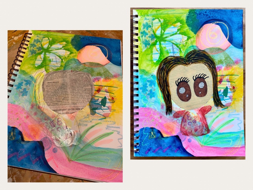 And now the time we’ve been waiting for…. drawing Little One! Once I figured out how and where to place her, I cut out a large circle from an old newspaper for her face. Coming back from France, I figured a French-language one would be cool! The one used here was just some scrap newspaper in which my gifts were wrapped. Now I wish I had collected a copy or two from France and as well as Spain! Once the face was painted with my usual blend of Quinacridone Nickel Azo Gold and Titanium White, I added the eyes with Molotow acrylic markers, followed by the hair first using the dropper from Antelope Brown ink. spreading with water then when dry drawing more with the markers. As with the dress, I first tried using some water soluble oil pastels like Neocolor II by Caran d’Ache to achieve a transparent look, but alas, the water would not spread on the waxy deli paper collage. Let’s see what we can do then!