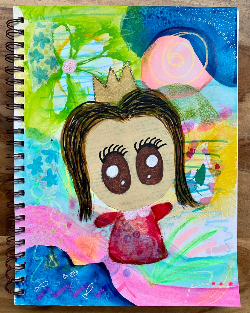 To resolve the problem about Little One’s red dress, I simply went for red acrylic ink, and it worked fine. The color remained quite transparent which was the objective. After having painted the collar and reflection of the eyes with white acrylic marker (Molotow), I then thought it would be a cute idea to add the crown to help balance the composition. Here I used gold, firstly some Full Body Paint by Golden, followed by Holbein’s Acryla gouache and outlined with some glitter glue. The background was further adorned with some white gel pen doodles and a dollop of shell pink gouache for the flower. And now, I think we’re done here!