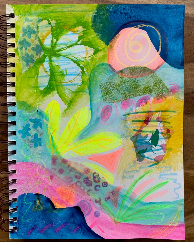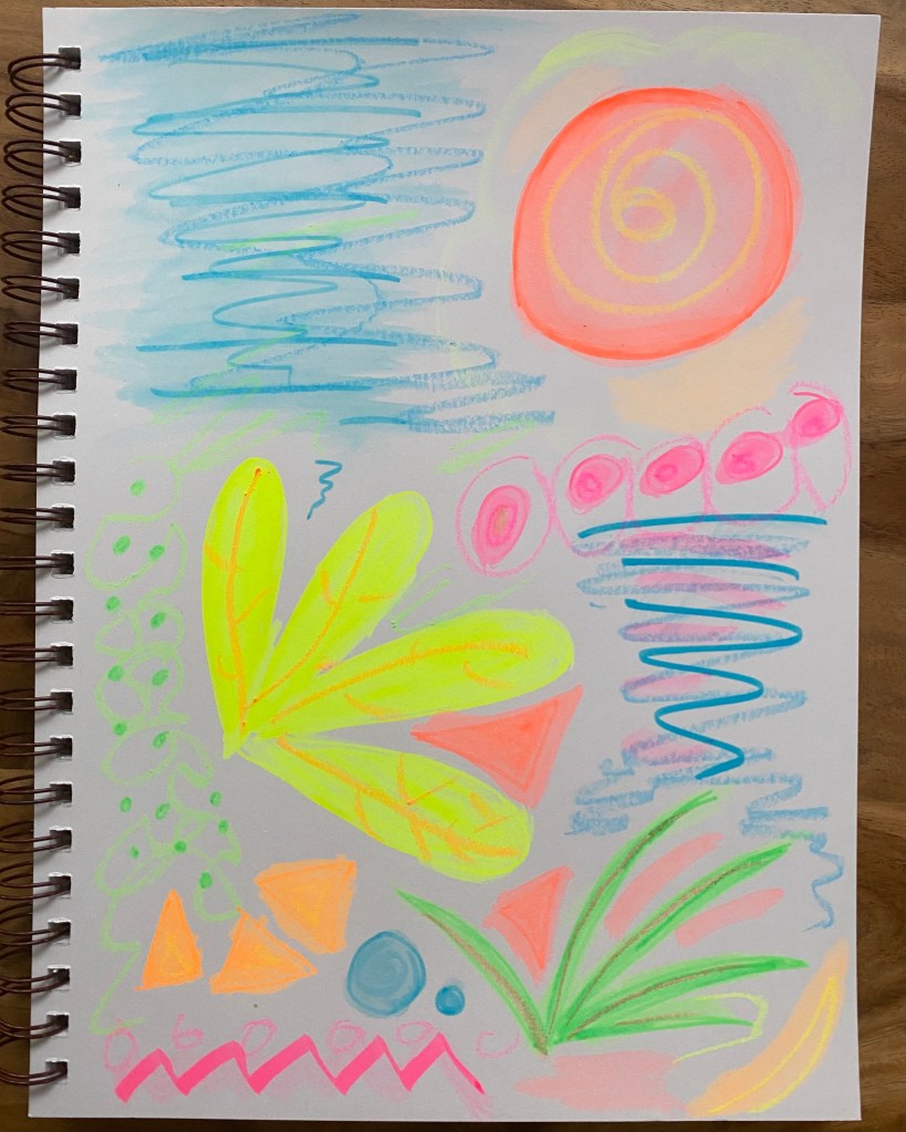 Like the pastel-tones, another phase I’m going through at the moment is finding as much as possible any art medium in neon colors. A few have been purchased lately, including a set of Winsor & Newton’s Promarkers alcohol ink pens and some oil pastels by Daler & Rowney. And on a blank page from my sketchbook Strathmore’s Visual Journal in Bristol Paper, I began scribbling away. Just random shapes and squiggles as well as flower and plants. And here is when I left it and took off on vacation.