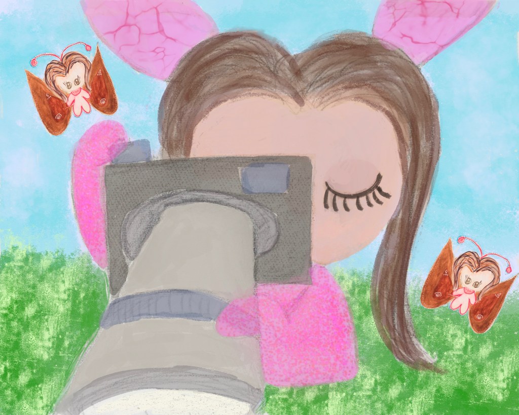 Oh look, Little One dreams of Springtime! Dressed as a pink bunny, she is taking photographs with a huge camera her boyfriend had lent her. They both enjoy nature photography, and she is trying to decide whether she should get her own. Surrounding her are a pair of cute little fairies. How pretty they look! And so my inspiration began. Last few weeks, I was busy following an online course by U.S. illustration artist Mindy Lacefield. “Procreate Cuties” was about, as the title suggests, learning to digitally create cute characters. What a perfect opportunity this was! Although I have been technically improving at digital art and already knew some of the stuff, this class was for enhancing what I already know, picking up more tips and developing more creatively. Over the lessons, I worked and practiced on the app creating quite a few cuties here I would like to share. And nowthe first one!