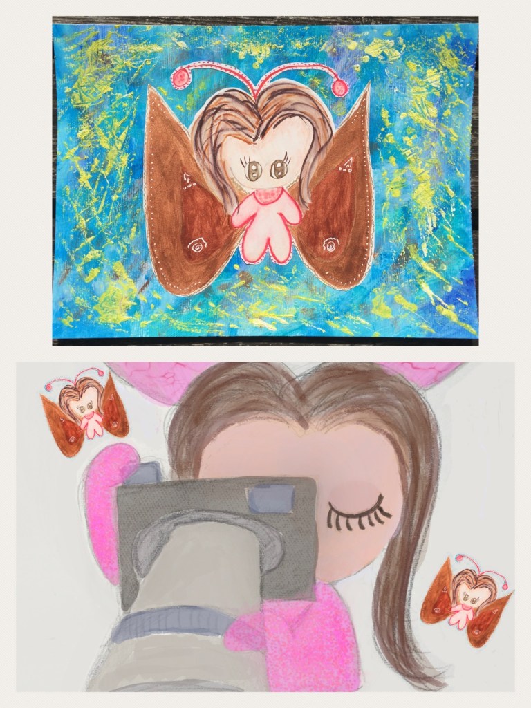 After incorporating some textured patterns on Little One’s costume and the camera body, I decided to develop further this idea of importing. I searched through my camera roll again and came across this cute little painting I had made many years ago too. A marker and watercolor drawing of Little One dressed as a fairy! Like the main drawing, the painting was imported and trimmed, but this time I also shrunk them in size before duplicating her into two fairies!
