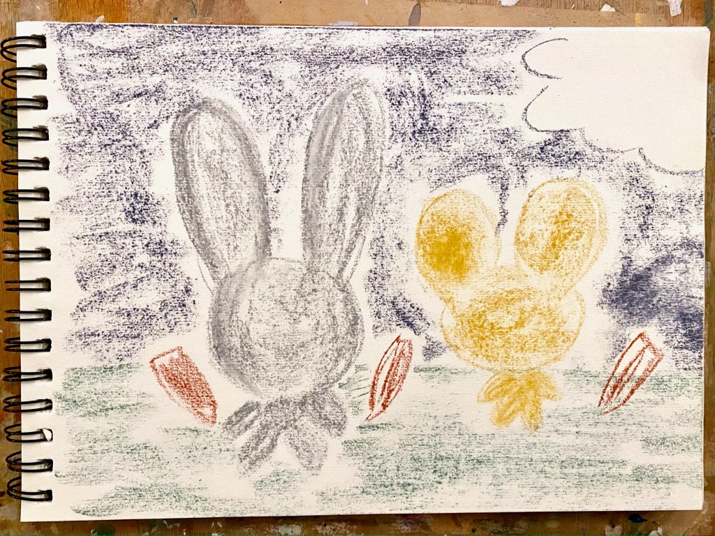 And now let’s put these to the test! On a page from Conda’s Drawing Pad I began by roughly sketching the bunny and teddy and filling them in with Silver Grey and Ochre Light, respectively. The edge of the sticks were used for the outline, then colored in with the flat side of one end. Then I doodled in the carrots which was a spontaneous decision actually, as I wanted to fill in the paper with something interesting. Interesting how they end up becoming the theme for this sketch! For the grass and sky, I also used the flat side of Olive Green and Payne’s Grey (which looks more a navy blue actually). A little space was left on the top right corner for the cloud which was filled in with Permanent White. Worth noting is that when sketching with these sticks, you don’t need to press hard, and that a very light touch and a little color goes a long way. In the end, you will be smudging the colors anyway so no need to go overboard!