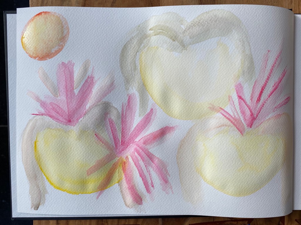 This painting is actually the result of following Juliette Crane’s free video introducing us to art journalling. Although I do a lot of my paintings in sketchbooks already, a proper art journal sketchbook was used for the first time here; one with a closed spine as opposed to one with a metal spiral binding. One of the advantages of this is that you could spread your painting on both sides, but today I only went for one side on which I began scribbling randomly with some watercolor. At this stage I had no idea how it will all develop but I found myself starting with the head of Little One, then adding two more heads followed by some red sparks and an orange sun. Kuretake Gansai Tambi watercolors were used here. So far so good! This sketchbook is actually intended for watercolors which was perfect. So what next?