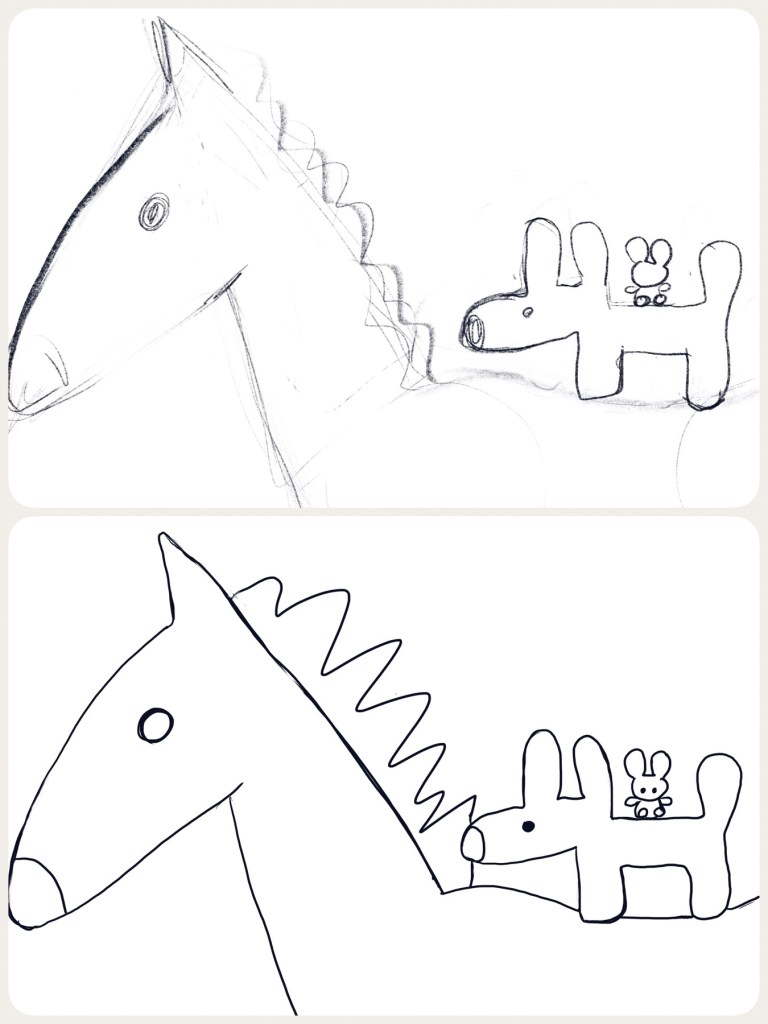 The true story begins with a horse trainer in the U.S. who rescued a pony called Spanky. The pet puppy, Dally, got taken to her and began jumping on her for a ride. Inspired, the trainer then had this brilliant idea to train this pony with the puppy on the back! I thought it was such a cute concept that I so had to sketch it and make it even more kawaii by adding a teddy bear riding on the puppy! And so the pencil sketch ensued, followed by tracing over with a Tech Pen for a more solid outline.