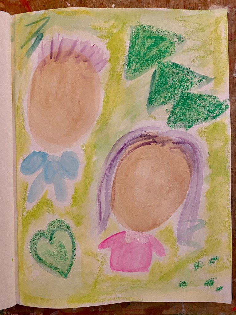 Whilst it’s customary to paint the background first, there is no hard and fast rules. The main reason people do it is so that the background and subjects don’t look disjointed. In this case, I wasn’t too bothered by it as it’s a rough doodle. The set of Faber Castell’s Gelatos in “Bright” was used for the background in that yellow-green shade. I also thought it would be an idea to further enhance the pink in the dress too! As for the Christmas tree and heart, I went over it with the green gelato. A thin wash of water was then applied over it to spread the color a little bit. Personally, I like it without diluting it with water and leaving it waxy which is why I went over it again on the trees and the outline of the heart.