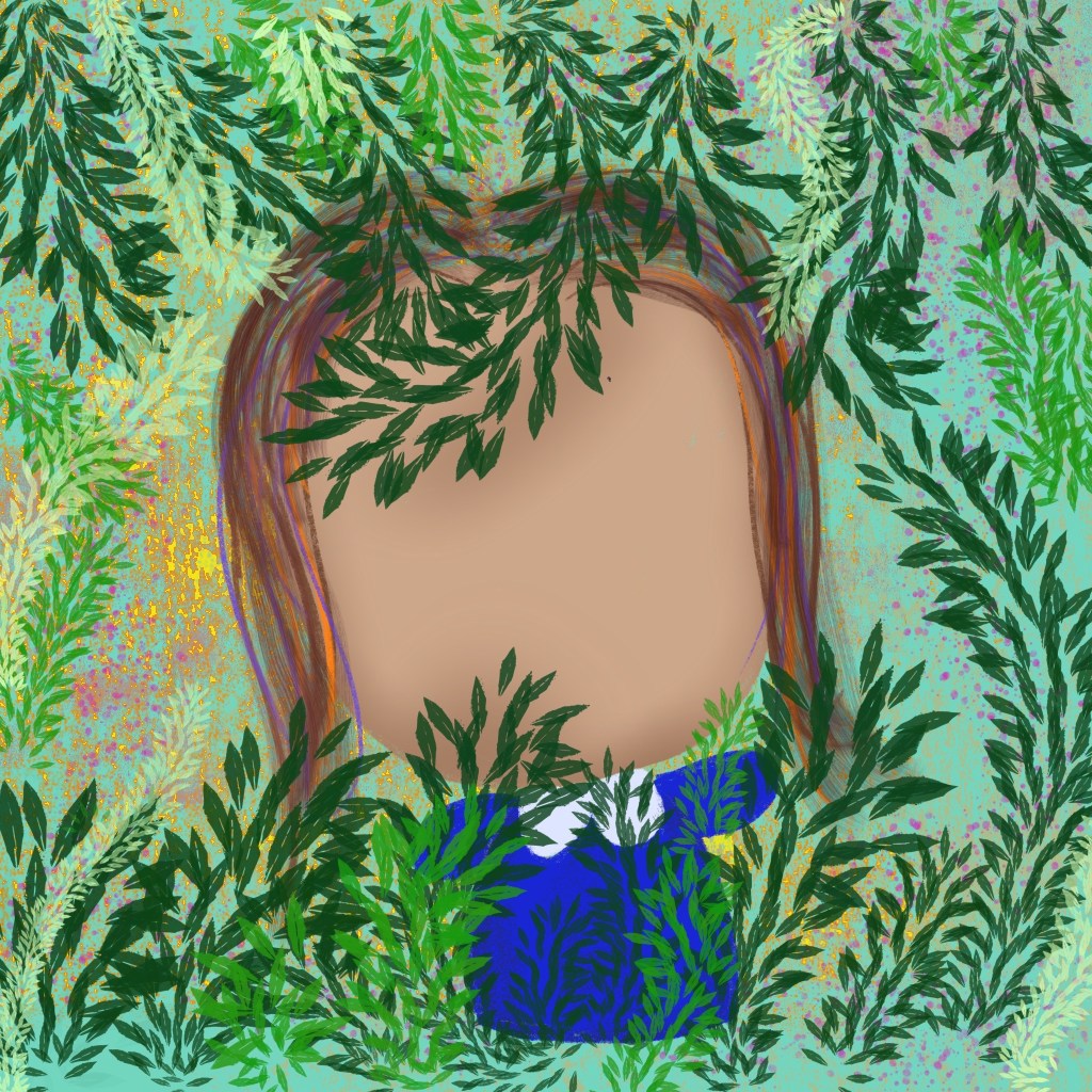 Time to draw Little One! I added a layer once again but shifted it to one below the leaves so that she is being partially covered by the foliage, hence standing in between layers. For this, I used the usual Medium Airbrush except for the hair which was painted in various fun colors with a Dry Square Inker brush. Some retouch was done on the hair with th P5 Hairy brush also by Jason’s. For each part of Little One, separate layers applied to make it easier to resize or reposition areas and use clipping masks where needed. Another great tip when having the subject like Little One between layers is to hide the one on top so you can see what you are painting; in this case, I hid the layer with all the foliage. I decided next to switch the background color to mint green and to soften the background, added some splashes of pink.