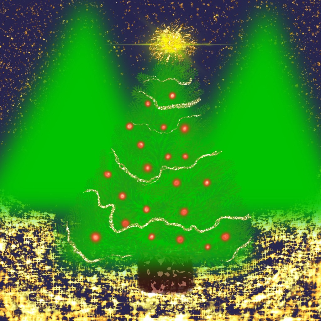 Now that I’ve got my Christmas Tree all pretty and decorated, what next? I was not sure what to do and was in a rut. As I had already drawn some characters in another Christmas painting, I thought I would just focus on the tree itself. How about adding more trees in the background then? However, the tree I had just decorated would remain as the centerpiece. I then traced my steps back and found the first layer in which the blurred green triangles were, then duplicated it twice and placed them on each side of the tree. What a great idea that was! To make the sparkles and lights pop out more, the background was then changed to something dark, this time navy blue.