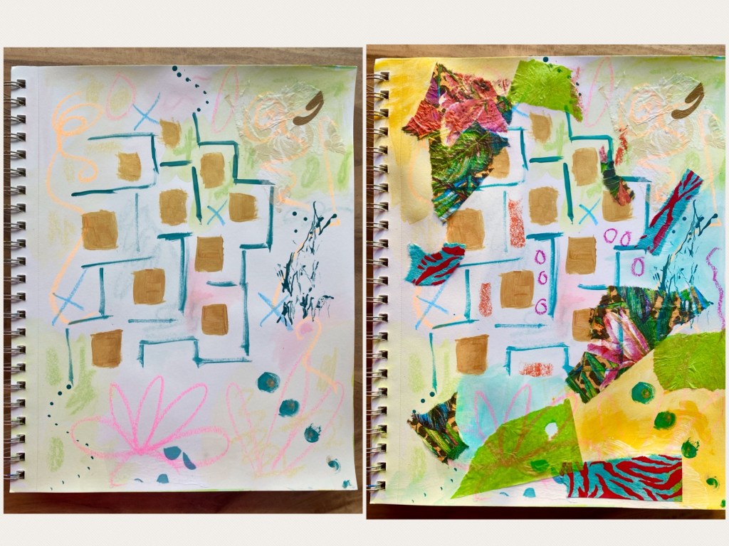Then I thought I’d try out my new Neon oil pastels by randomly scribbling on top of the leftover paints with some neon oil pastels by Faber Castell I had purchased earlier. This was followed by some light green water soluble oil pastels in the form of Faber Castell’s Gelatos, then spread with a wet brush. I further added some gold and light blue acrylic ink and once dry, glued on bits of collage paper including paper napkins, wrapping tissue and Mulberry paper. The center bit was deliberately left free of collage to give space for my character.