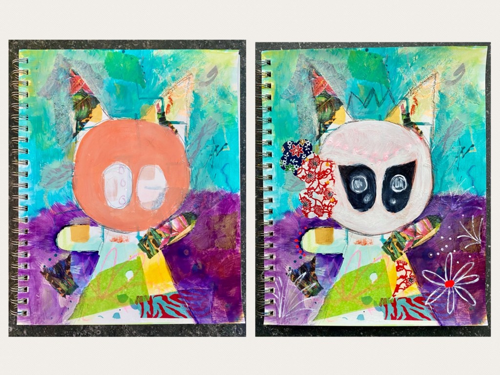 I continued with the negative space background by painting with some Teal for the sky. Although I was pleased with it, I was not too sure about my character. It didn’t look like a pig for one thing as the ears were too long although I did like the colors from the paper napkin collage on the layer below. Not wanting to alter the shape of the ears, it was then that I decided to switch her into something I am more comfortable with painting: a cat! And there I went about changing the eye shape, adding a crown on top and doodling some flowers on the background with some white Moltow marker. Some neon red gouache was also dotted around. However, I didn’t like the roundness of her face. A few pieces of craft-punched origami paper flowers were then introduced to frame it and make it look less round.