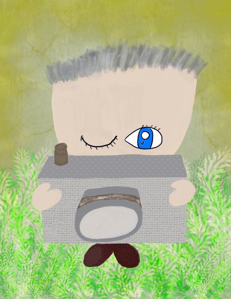 Once I was done trimming the drawing (left), I proceeded in coloring. For each area of the subject including the camera parts, I used a different layer. This makes it easier to tweak any such area when needed, ie. making the eyes bigger as we see below. And as demonstrated later, adding texture becomes easier too as we use the Clipping Mask tool. The brush used was the Dry Square Inker but in future I may like to switch back to the Medium Airbrush as it gives better coverage. Once done, I changed the background color to light blue and added some texture stamps in white. This is just the beginning, and so far looking good!