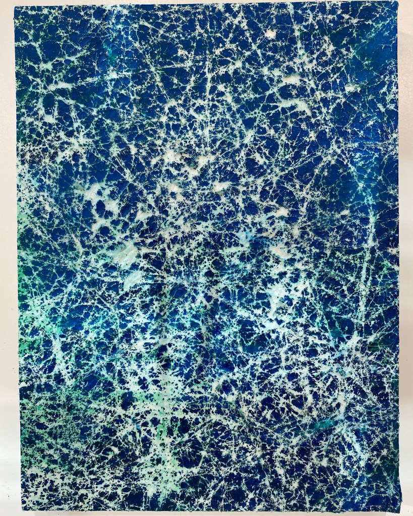 Otherwise known as Nihonga, the traditional Japanese watercolor painting entails natural dyes and pigments. Best results come from starting with powder pigments and blending with an animal based gelatin binding material called nikawa and a few drops of hot water. Click here for more about it. For this painting came the momigami method in which the first layer of color is applied thickly on a sheet of special washi paper. Another color is then piled on top once dry. Here I firstly went for emerald green and let it dry before covering it with a thick layer of cobalt blue. Then when completely dry, the paper gets crumpled up; the more the better! The result is a stunning marble appearance as below.